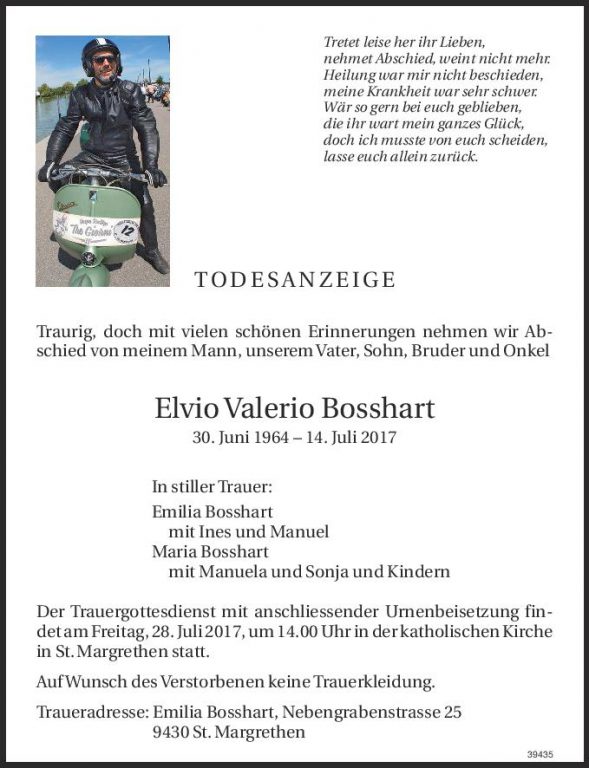 Unser gemeinsamer Freund ELVIO BOSSHART hat den Kampf gegen seine Krankheit verloren. Er ist am vergangenen Freitag, 14.07.17 verstorben. Unsere aufrichtige Anteilnahme gilt besonders seiner Frau Emilia und seiner ganzen Familie. Wir sind alle sehr traurig über den Verlust unseres lieben Freundes.