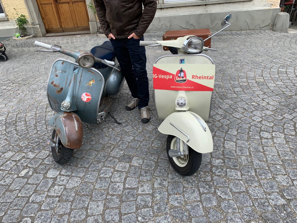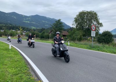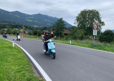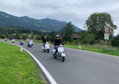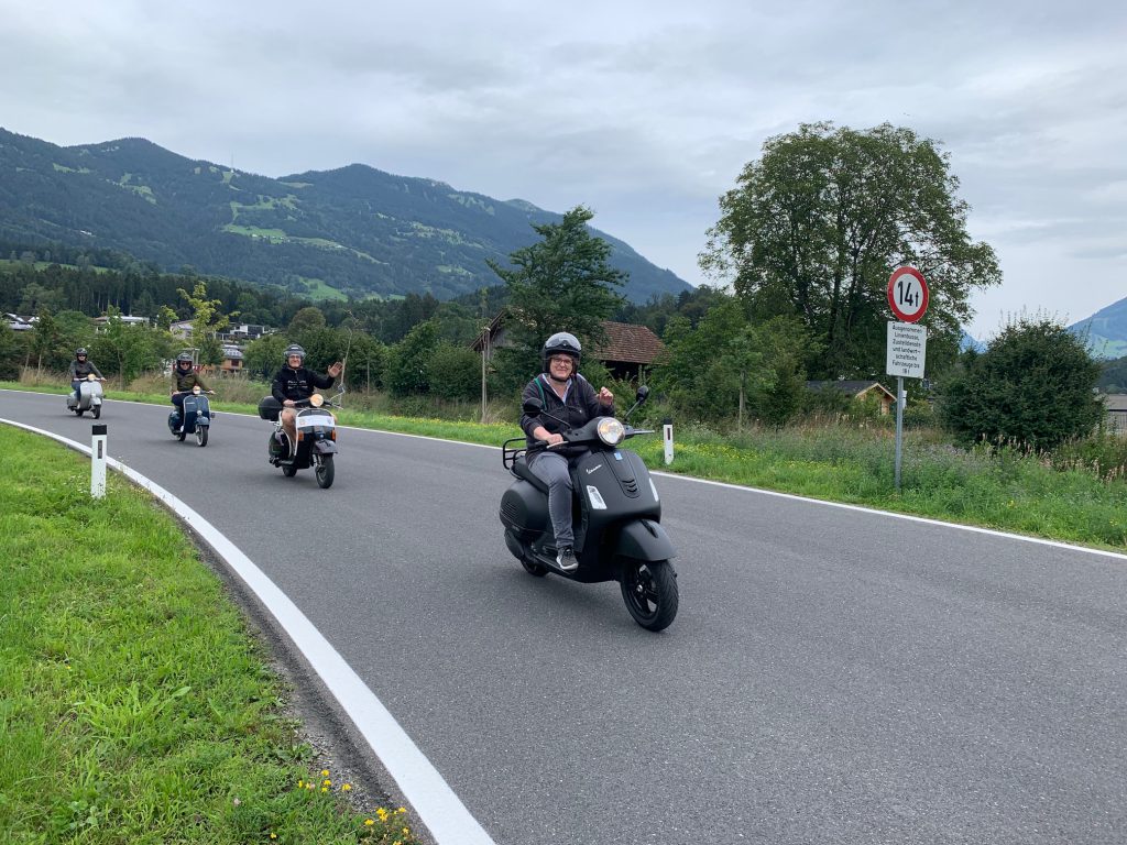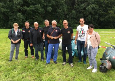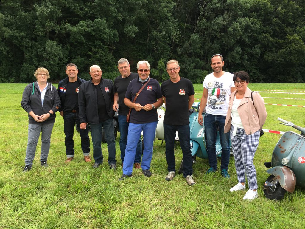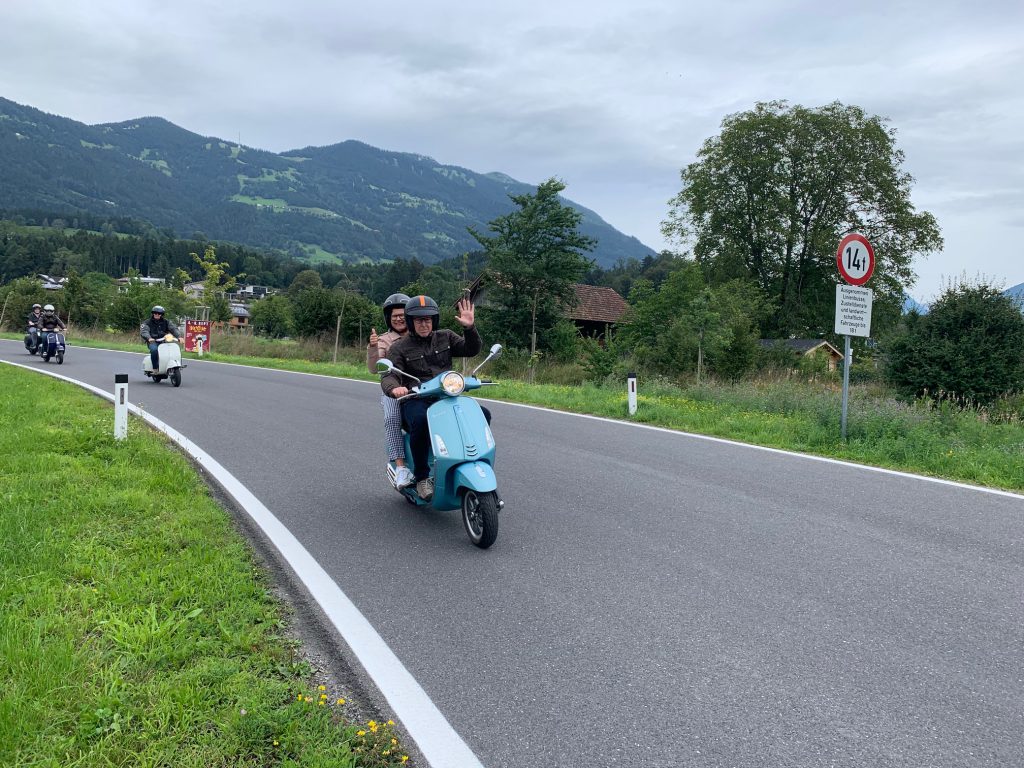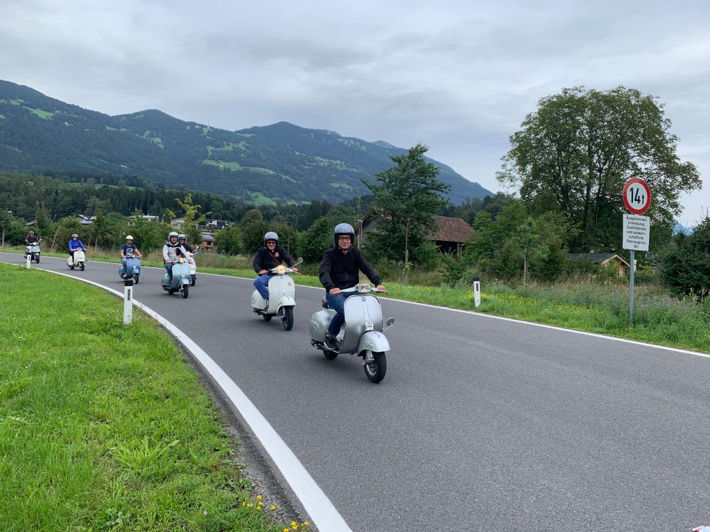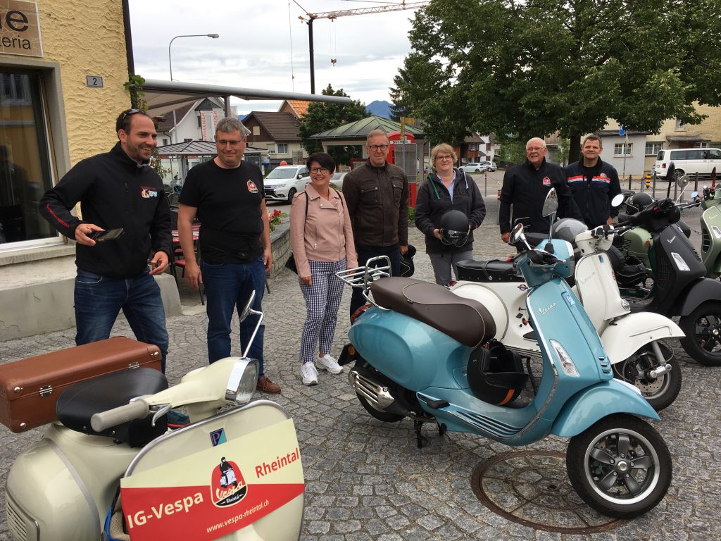 Acht Mitglieder der IG-Vespa, Donat, Migg, Marcel, Pascal, Karin, Jörg, Rita und Fritz fuhren am Samstag, 17.8.19 mit ihren Vespas zum Treffen nach Koblach.