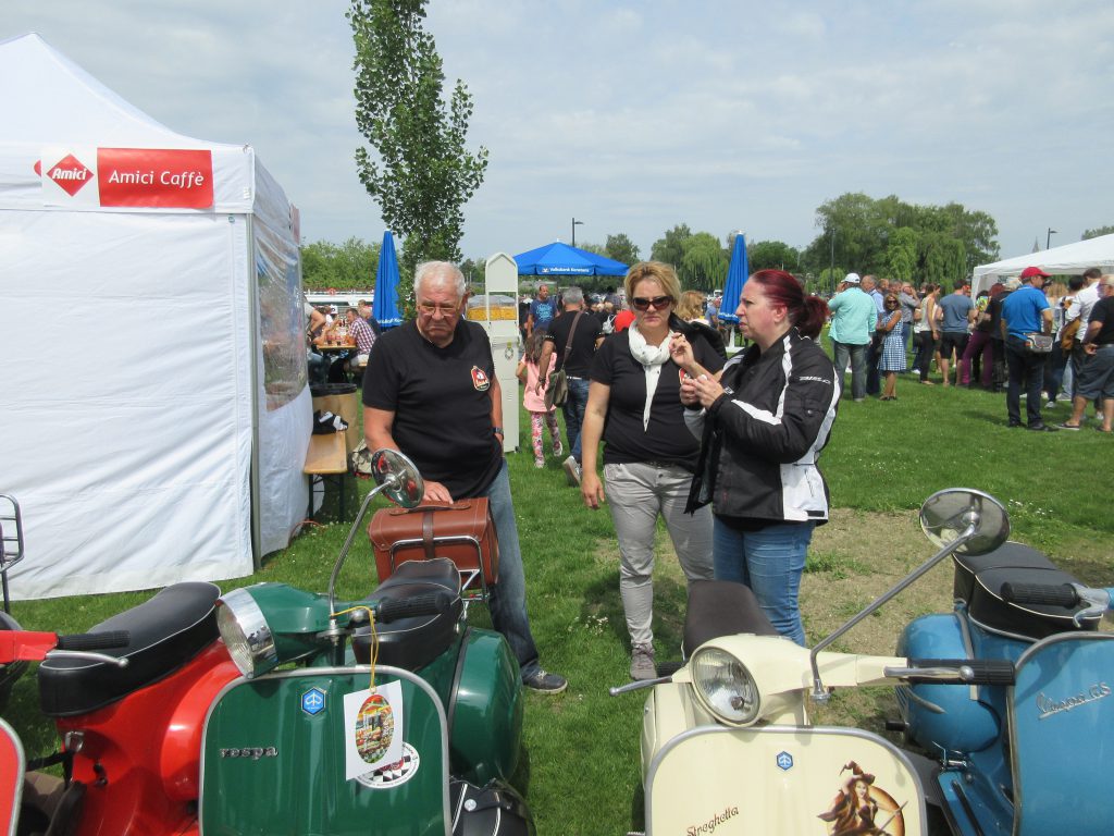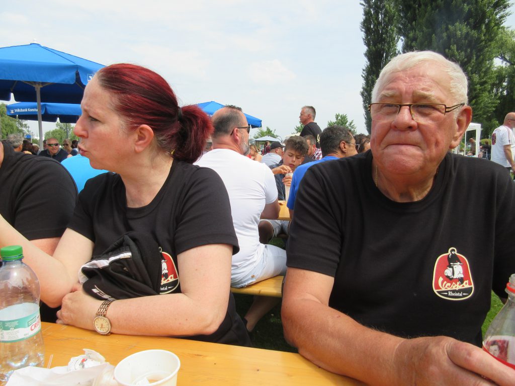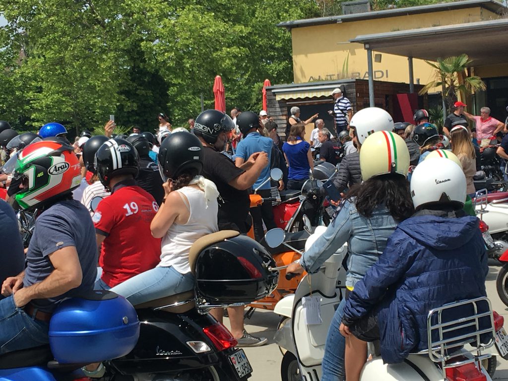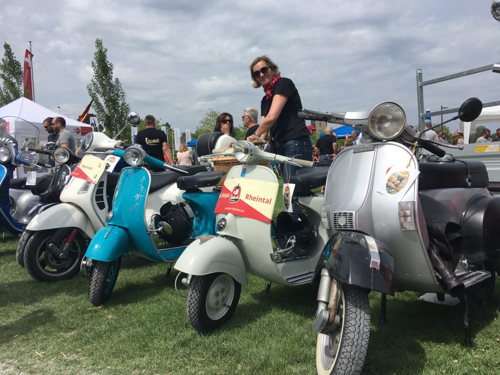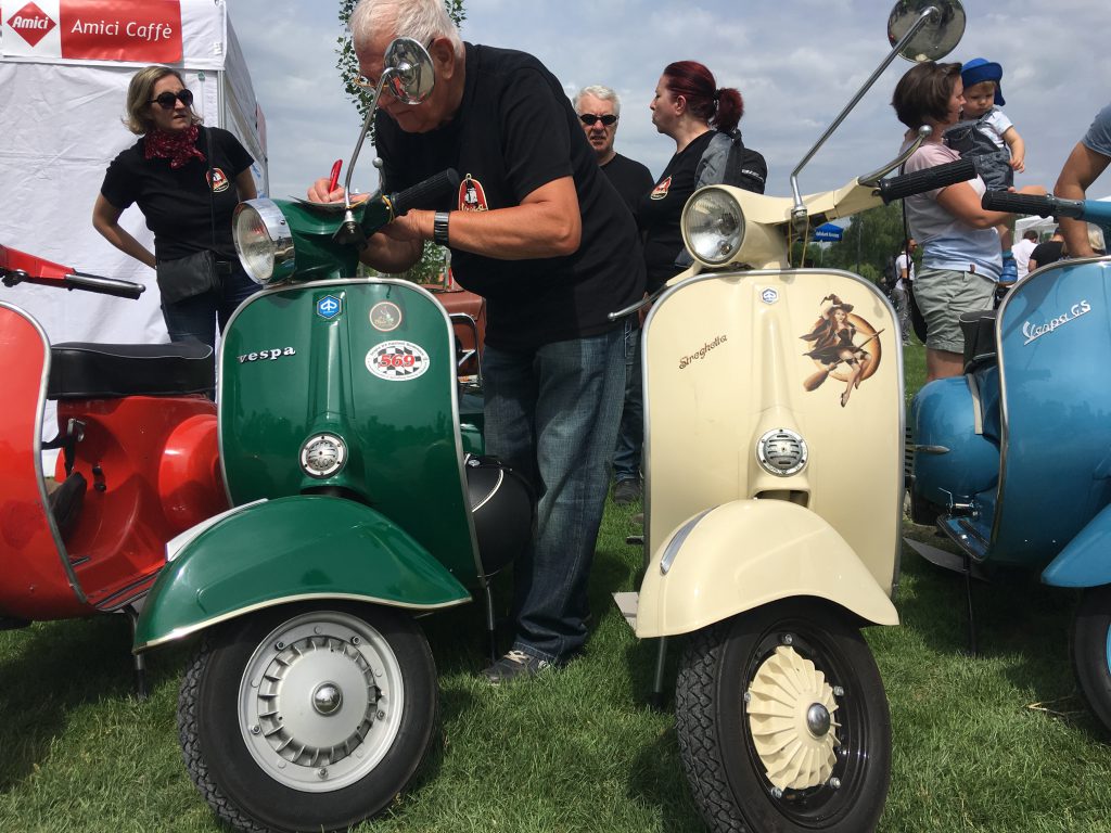 Nach einem Mittagessen haben wir die alten, neuen, getunten und restaurierten Fahrzeuge bestaunt, Fotos geschossen und alte Bekannte (Bruno) getroffen. Wir haben uns dieses Jahr zu den Schaulustigen bei der Abfahrt des Corso’s gestellt. Gefühlte mehrere hundert Vespas haben sich in Position gestellt, geknattert, die Luft mit ihren Abgasen geschwängert und irgendwann haben alle im Globo gehupt. Das ging einem richtig unter die Haut.