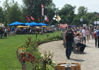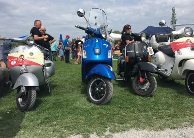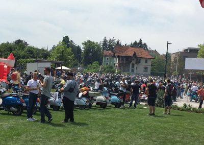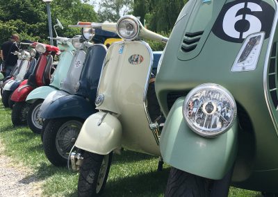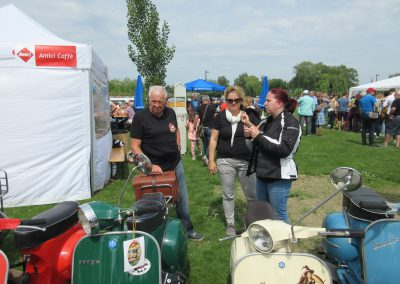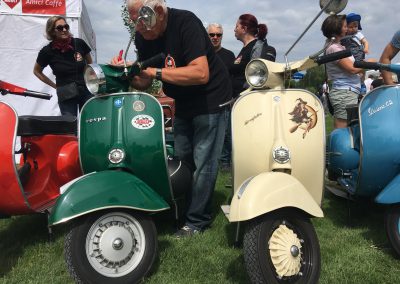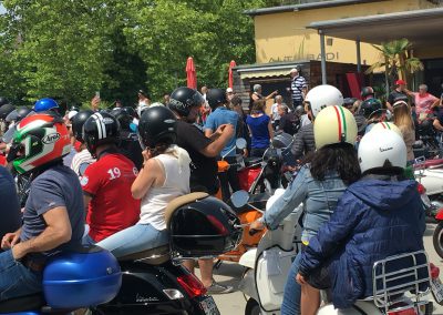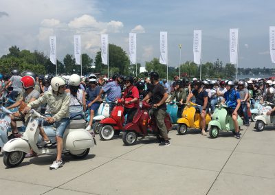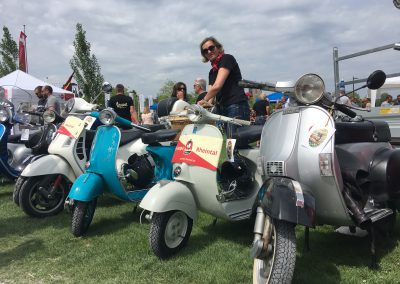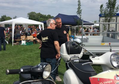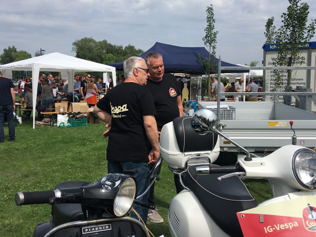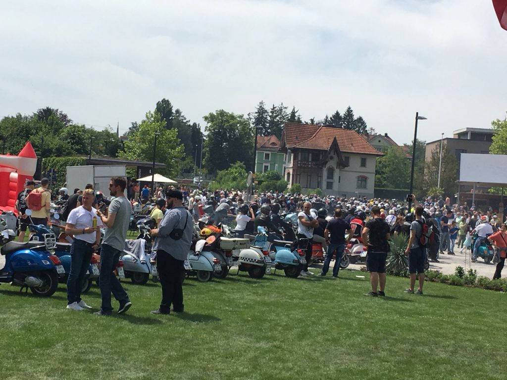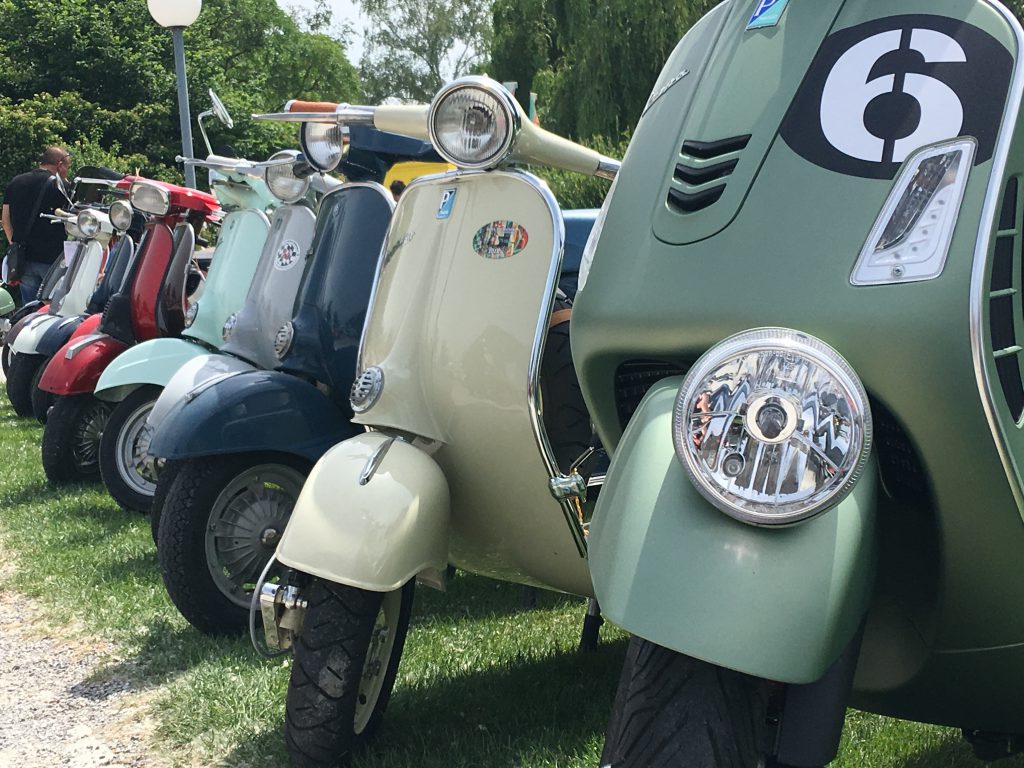 Nach einem Mittagessen haben wir die alten, neuen, getunten und restaurierten Fahrzeuge bestaunt, Fotos geschossen und alte Bekannte (Bruno) getroffen. Wir haben uns dieses Jahr zu den Schaulustigen bei der Abfahrt des Corso’s gestellt. Gefühlte mehrere hundert Vespas haben sich in Position gestellt, geknattert, die Luft mit ihren Abgasen geschwängert und irgendwann haben alle im Globo gehupt. Das ging einem richtig unter die Haut.