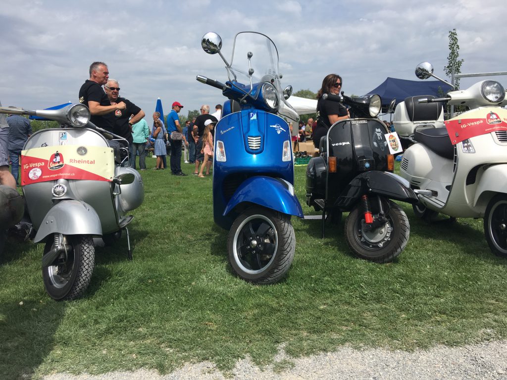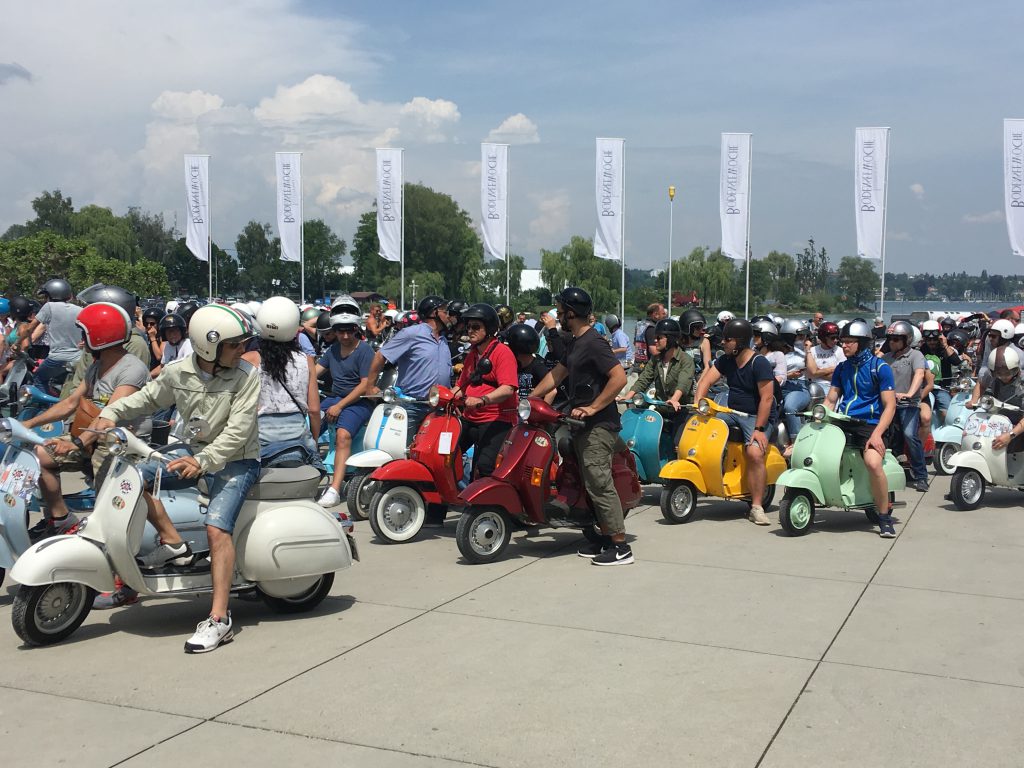 Das diesjährige Vespatreffen in Kreuzlingen hat wieder mehrere hundert begeisterte Vespisti angelockt. Auch wir sind freudig nach Kreuzlingen gedüst. Mit von der Partie waren Emilia, Migg, Freddy, Semia, Armin, Marina, Donat und ich. Um 9.15 Uhr sind wir mit 7 Vespas Richtung Rorschach abgefahren. Vor dem Rorschacher Hafen ist Christian mit seiner GS noch dazu gestossen. Weiter ging’s nach Romanshorn zum kurzen Kaffeehalt und anschliessend sind wir direkt nach Kreuzlingen an den Hafen gefahren.