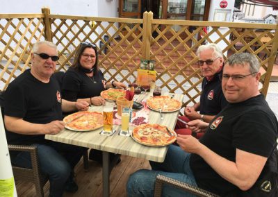 In Oberriet kamen dann die ersten Regentropfen und wir entschieden uns, die Regenbekleidung anzuziehen. Via Vaduz fuhren wir über die Luzisteig nach Maienfeld, wo wir die erste Kaffeepause machten. Weiter ging es nach Chur. Der Regen wurde immer intensiver und es wurde ungemütlicher. Klatsch nass und steif vor Kälte machten wir in Bergün Mittagspause. Nach der Pause liess der Regen etwas nach, aber es regnete immer noch intensiv. Dann ging es hinauf auf den 2000 Meter hohen Albulapass. Es war saukalt und nass. Wir stiessen fast an unsere Grenzen. Unser nächster Pass war der 2300 Meter hohe Berninapass. Auf der Passhöhe hörte der Regen auf. Durchgefroren wollten wir nur noch hinunter ins Tal. Der Himmel wurde heller und heller, und in Poschivo schien sogar die Sonne. Wir bezogen unsere Zimmer im Hotel Altavilla. Weil das Wetter so schön war, haben wir uns entschlossen noch nach Tirano auf einen Apero zu fahren.