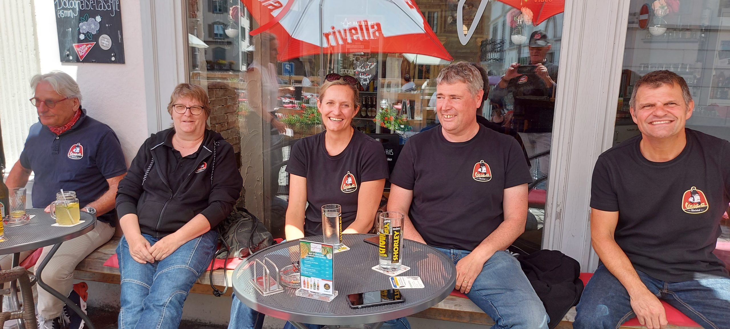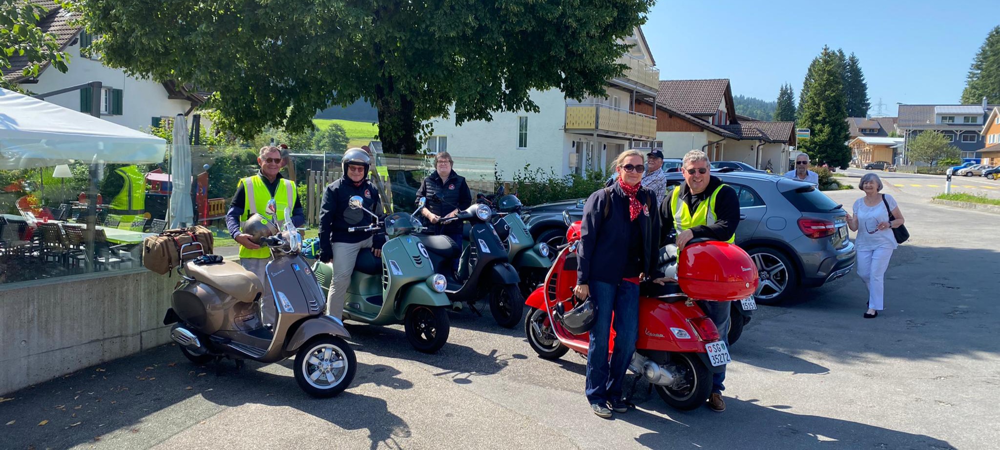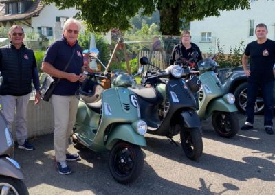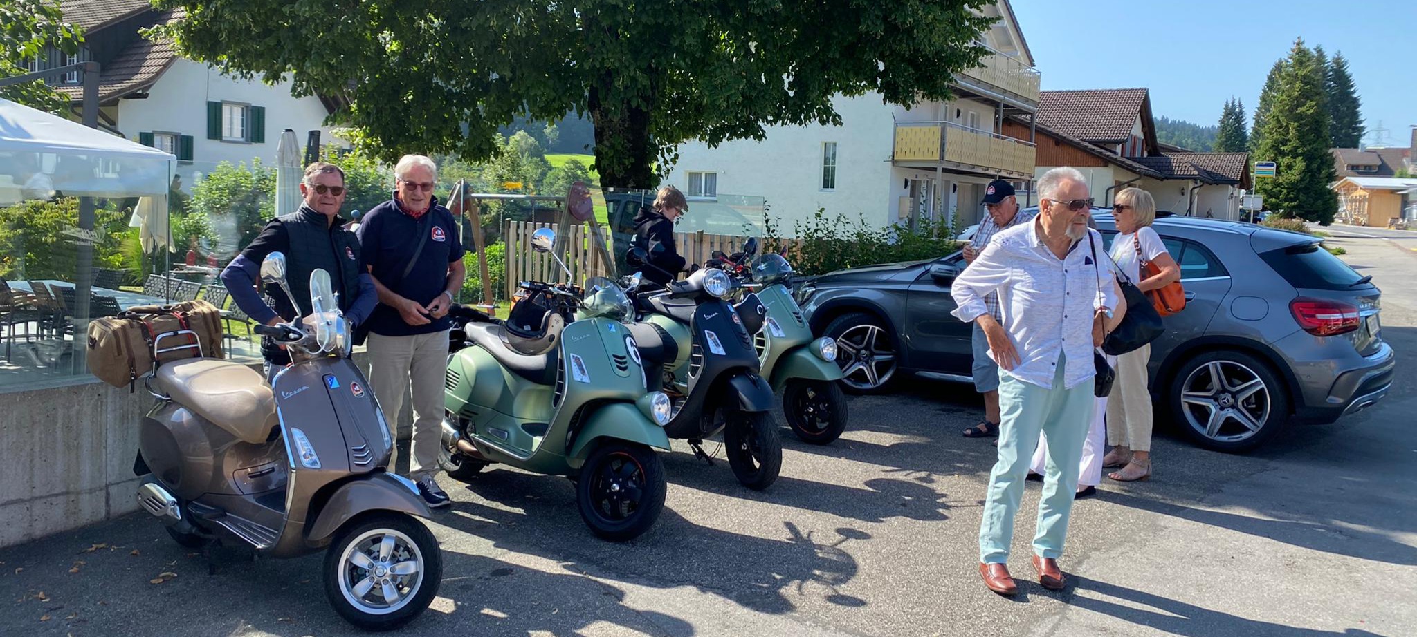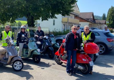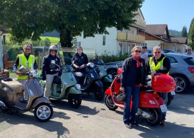Der Treffpunkt war der Gaiserbahnhof in Altstätten. Wir, Donat, Silke, Rolf, Karin, Marcel und Fritz mit unseren Vespas konnten den Start unsere Reise kaum erwarten. Wir mussten uns noch etwas gedulden, bis das Begleitfahrzeug von Migg mit Trudy, Christian und Ursula zu uns gestossen war.  Kaum war der Mercedes angekommen, brausten wir los.