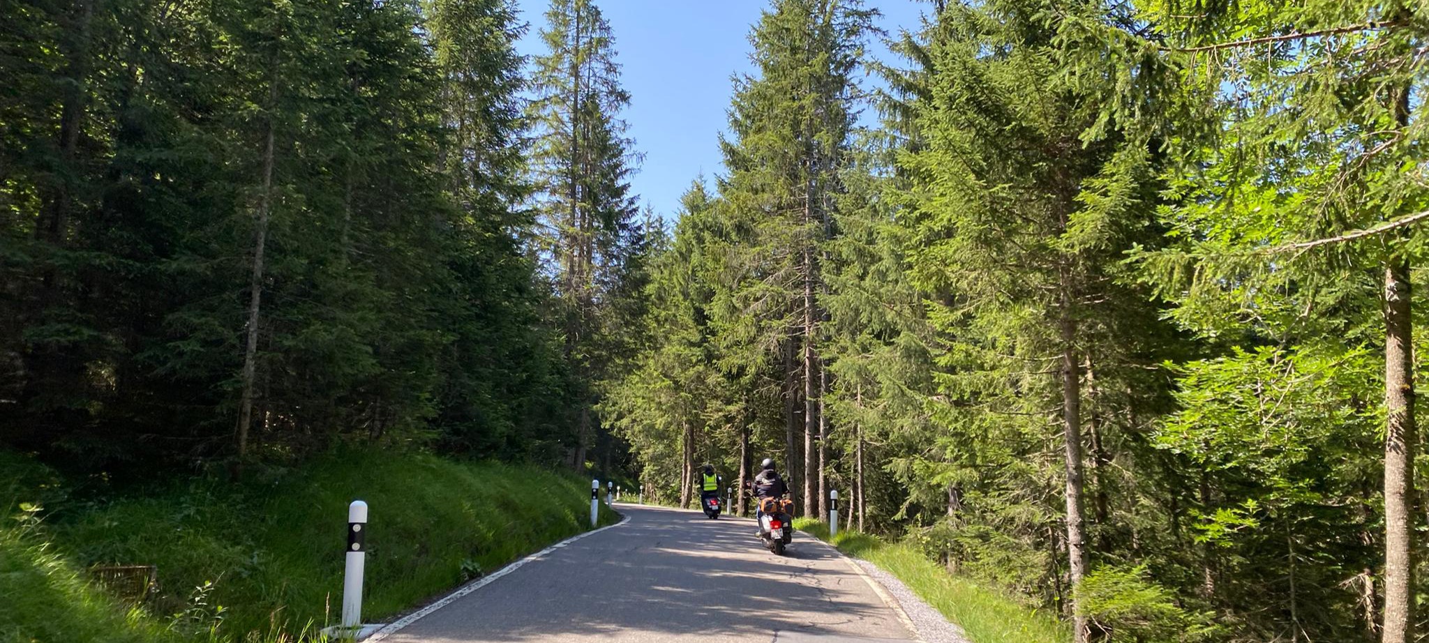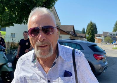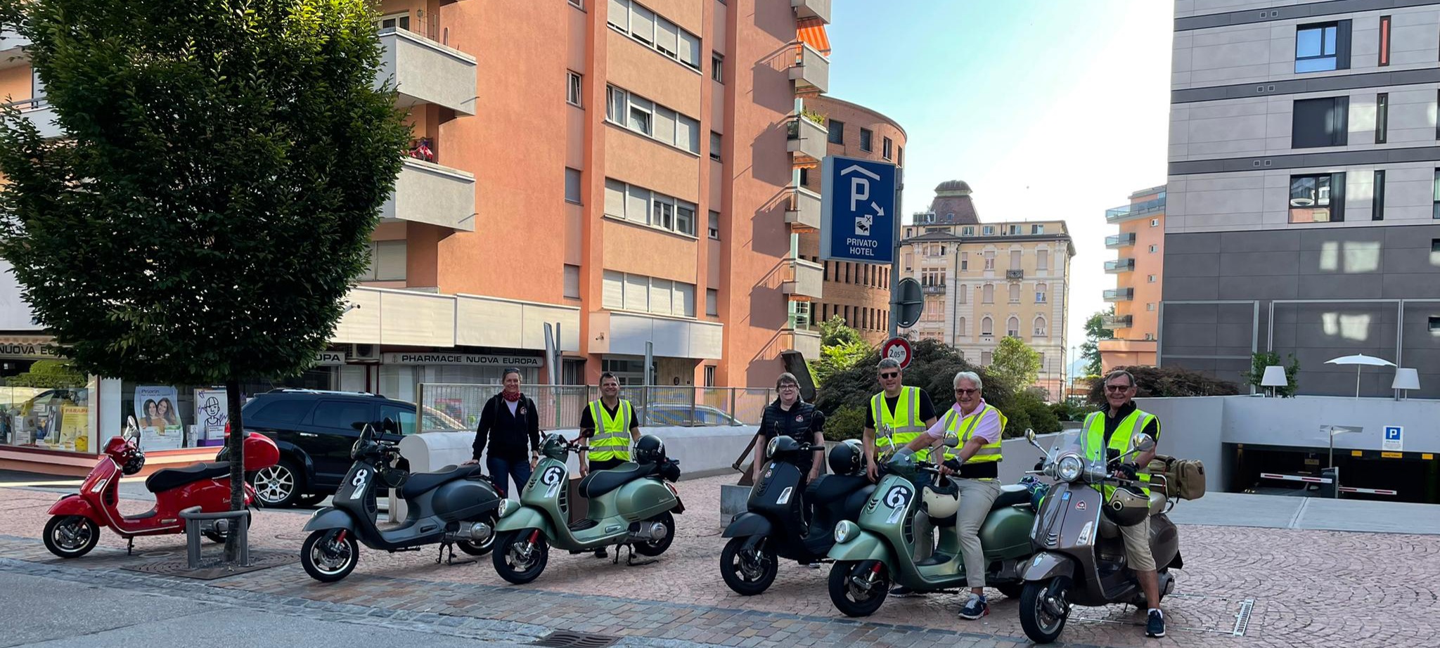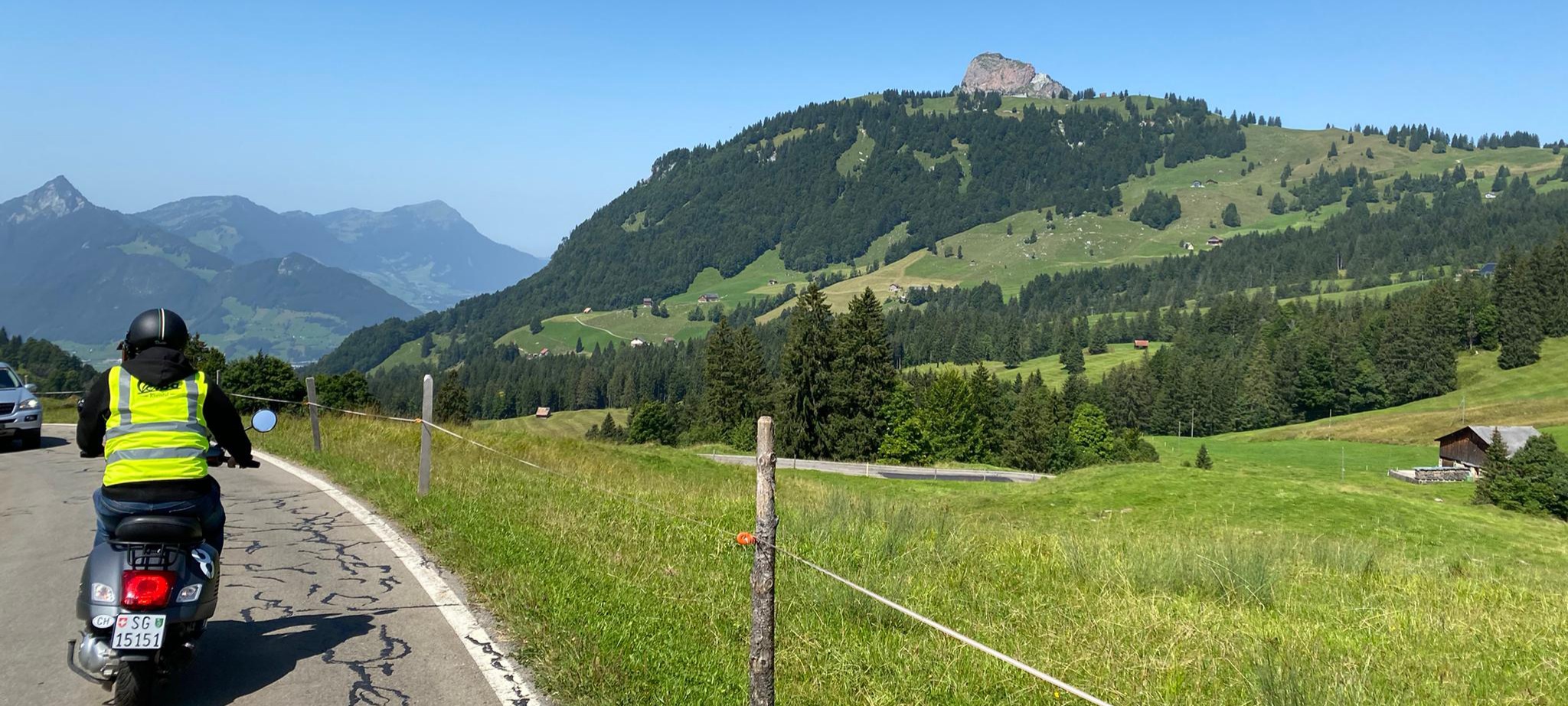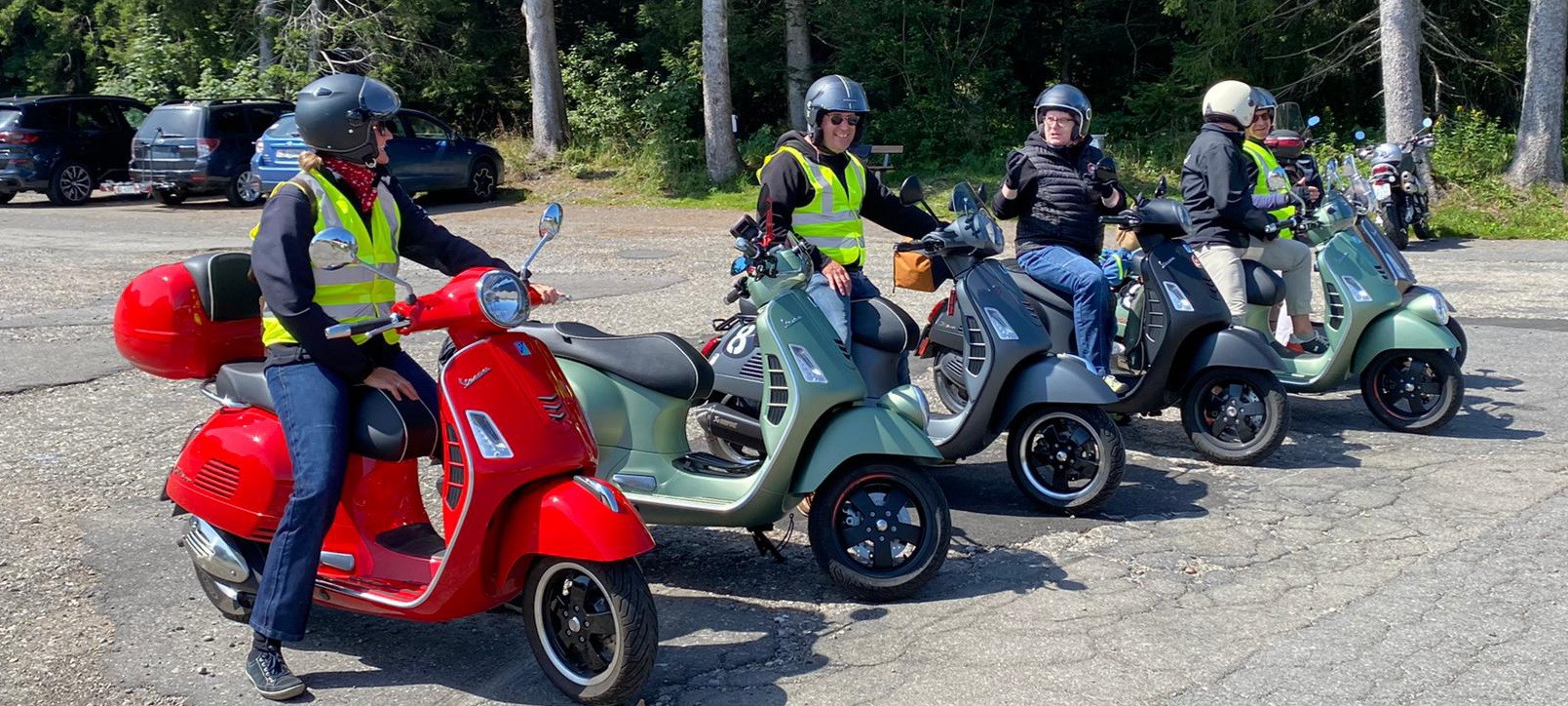 Der Treffpunkt war der Gaiserbahnhof in Altstätten. Wir, Donat, Silke, Rolf, Karin, Marcel und Fritz mit unseren Vespas konnten den Start unsere Reise kaum erwarten. Wir mussten uns noch etwas gedulden, bis das Begleitfahrzeug von Migg mit Trudy, Christian und Ursula zu uns gestossen war.  Kaum war der Mercedes angekommen, brausten wir los.