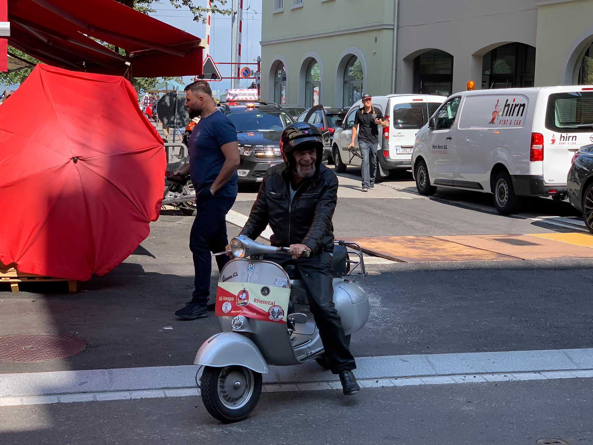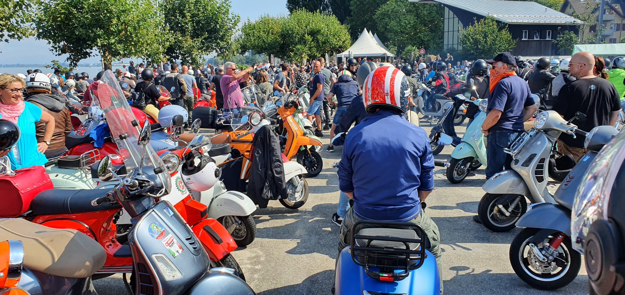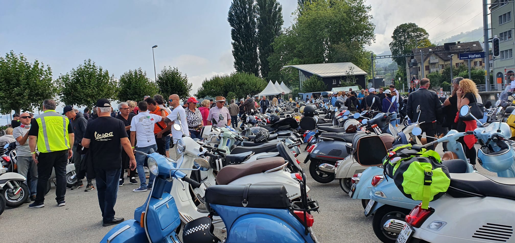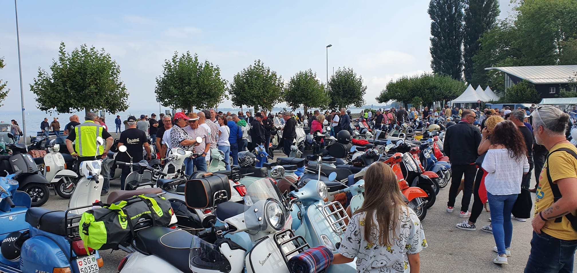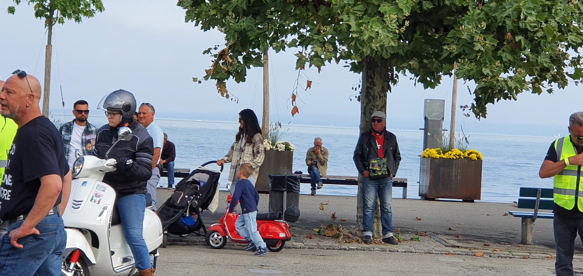 Der Treffpunkt war wie immer das Schäfli in St. Margrethen. Von dort fuhren wir unter der Führung von Donat über Thal, Rorschacherberg, Untereggen nach Rorschach. Kaum zu glauben. Über 500 Vespistis, Freunde und gleichgesinnte trafen sich am Hafenplatz. Es war ein Fest sondergleichen, eine bunt gemischte Gesellschaft aus Schweizern, Österreichern, Deutschen aber vorwiegend Italienern. Sie sorgten für ein ganz grosses Fest. Die Freundschaft und die Gemeinschaft und das Fachsimpeln über Vespas sind Tradition.